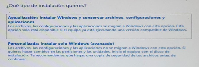 6:Ahora el programa de instalación nos da a elegir si queremos actualizar a Windows 8 desde una versión anterior de Windows ya instalada previamente en el sistema, o si queremos realizar una instalación nueva de Windows 8. En nuestro caso, instalamos desde cero en una partición vacía (sin datos existentes), por lo que elegimos la opción “Personalizada”