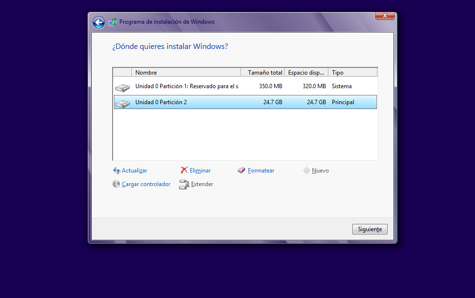 8: Escogemos el disco duro o partición de disco que formateamos par hay instalar Windows 8 y pulsamos sobre “Siguiente”.